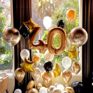 - Globos látex en tonos dorados, negros y perlados hinchados con helio profesional y con aire para el suelo