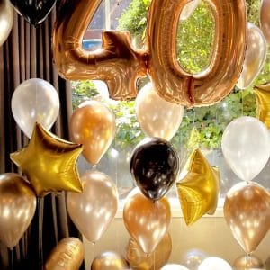 - Alrededor de 20 globos de látex en tonos oro, plata y negro o perla hinchados con helio profesional