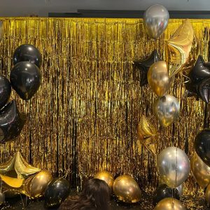 - Estrellas foil en tonos dorados y negros hinchados con helio profesional.