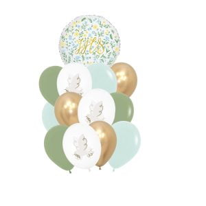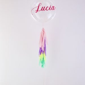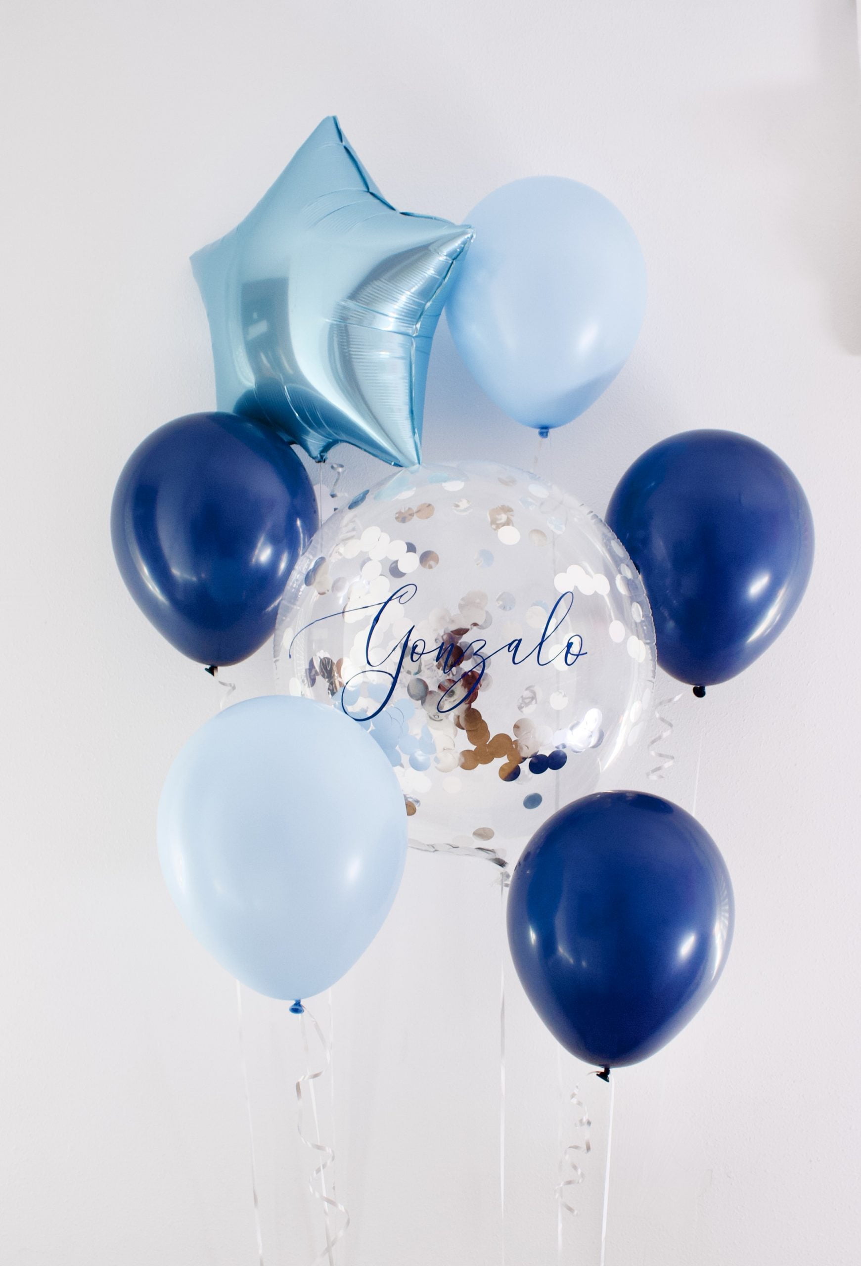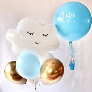 - Globos de látex en tonos a elegir (rosa, verde, azul) hinchados con helio y tratados para maximizar su duración.