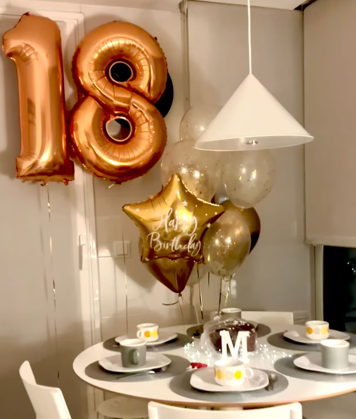 - Estrellas foil en tonos dorados y negros hinchados con helio profesional.