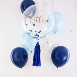 - Globo Burbuja transparente de 45 cm con miniglobos de látex en su interior, todo hinchado con helio.