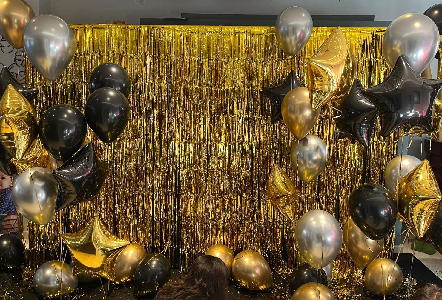 Photocall con flecos y globos en tonos dorados